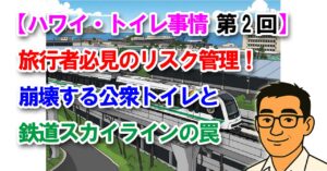 アロハ!sasshi(サッシ)です! 前回の第1回では、ワイキキの高級ホテルや最新の不動産市場において、ウォシュレットが「ラグジュアリーとウェルネスの象徴」として標準化している華やかな現実をお伝えしました。ハワイのトイレ … 続きを読む 【ハワイ・トイレ事情 第2回】旅行者必見のリスク管理!崩壊する公衆トイレと鉄道スカイラインの罠