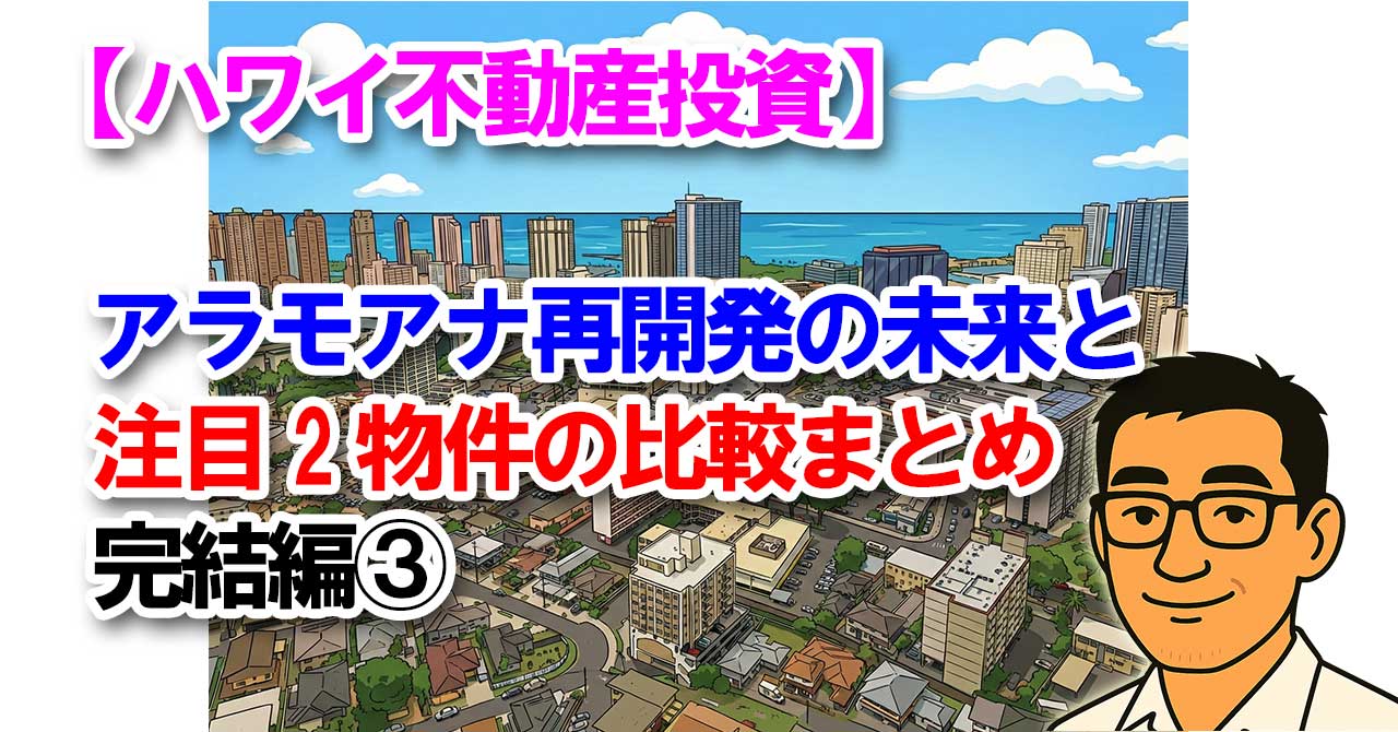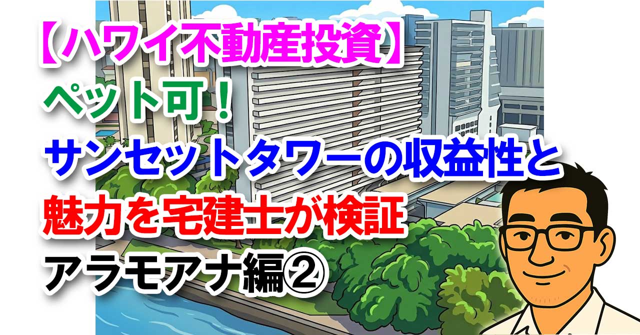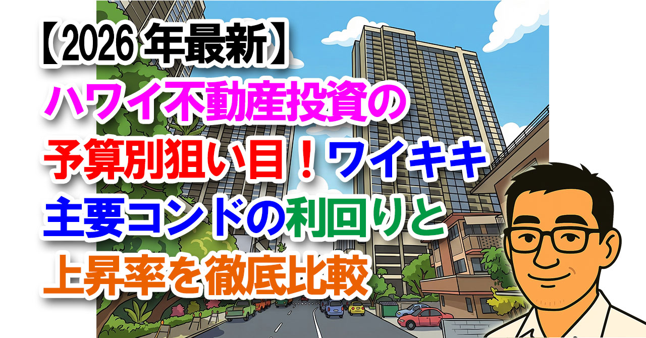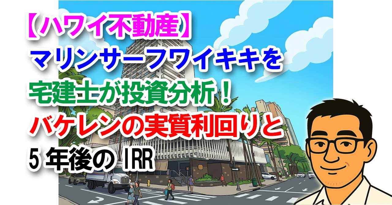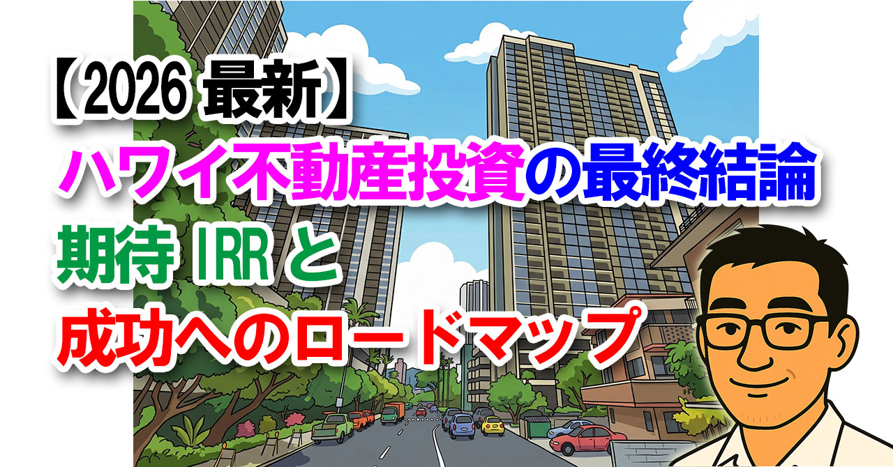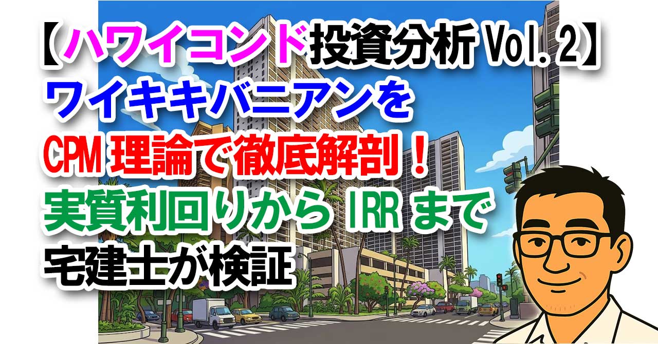TAG 投資分析 【ハワイコンド投資分析Vol.2】ワイキキバニアンをCPM理論で徹底解剖!実質利回りからIRRまで宅建士が検証 2026.03.20 ハワイ不動産 sasshi sasshi's Hawaii blog ハワイ不動産は今が買い時?2026年最新オアフ島相場と投資の展望 2026.03.17 ハワイ不動産 sasshi sasshi's Hawaii blog 【ハワイコンド投資分析Vol.1】アイランドコロニーをCPM理論で徹底解剖!実質利回りからIRRまで宅建士が検証 2026.03.16 ハワイ不動産 sasshi sasshi's Hawaii blog 【ハワイ不動産】マリンサーフワイキキを宅建士が投資分析!バケレンの実質利回りと5年後のIRR 2026.02.23 ハワイ不動産 sasshi sasshi's Hawaii blog 【ハワイ不動産投資】アラモアナ再開発の未来と注目2物件の比較まとめ|完結編③ 2026.02.21 ハワイ不動産 sasshi sasshi's Hawaii blog 【ハワイ不動産投資】ペット可!サンセットタワーの収益性と魅力を宅建士が検証|アラモアナ編② 2026.02.20 ハワイ不動産 sasshi sasshi's Hawaii blog 【ハワイ不動産投資】20万ドル台アトキンソンプラザを宅建士が徹底分析|アラモアナ編① 2026.02.19 ハワイ不動産 sasshi sasshi's Hawaii blog ハワイ不動産投資の最終結論【2026最新】期待IRRと成功へのロードマップ 2026.02.14 ハワイ不動産 sasshi sasshi's Hawaii blog 【2026年最新】ハワイ不動産投資の予算別狙い目!ワイキキ主要コンドの利回りと上昇率を徹底比較 2026.02.13 ハワイ不動産 sasshi sasshi's Hawaii blog 2026年の増税と「保険料暴騰」の真実。知っておくべきハワイ投資の守り方 2026.02.12 ハワイ不動産 sasshi sasshi's Hawaii blog もっと見る